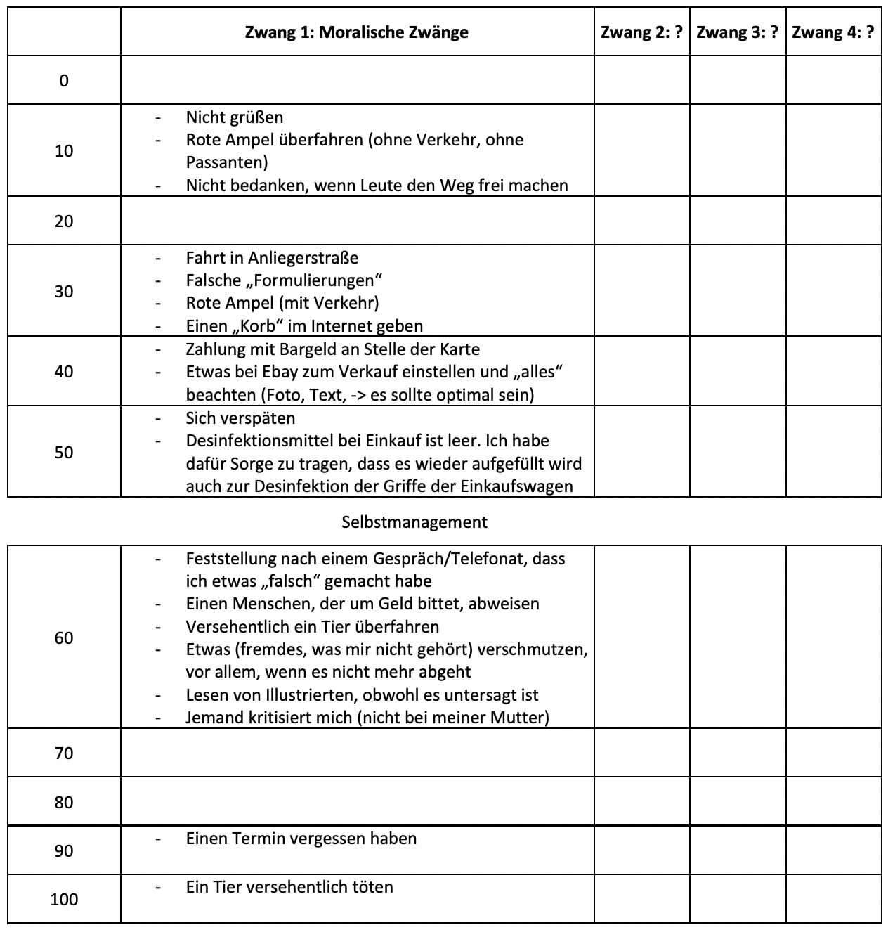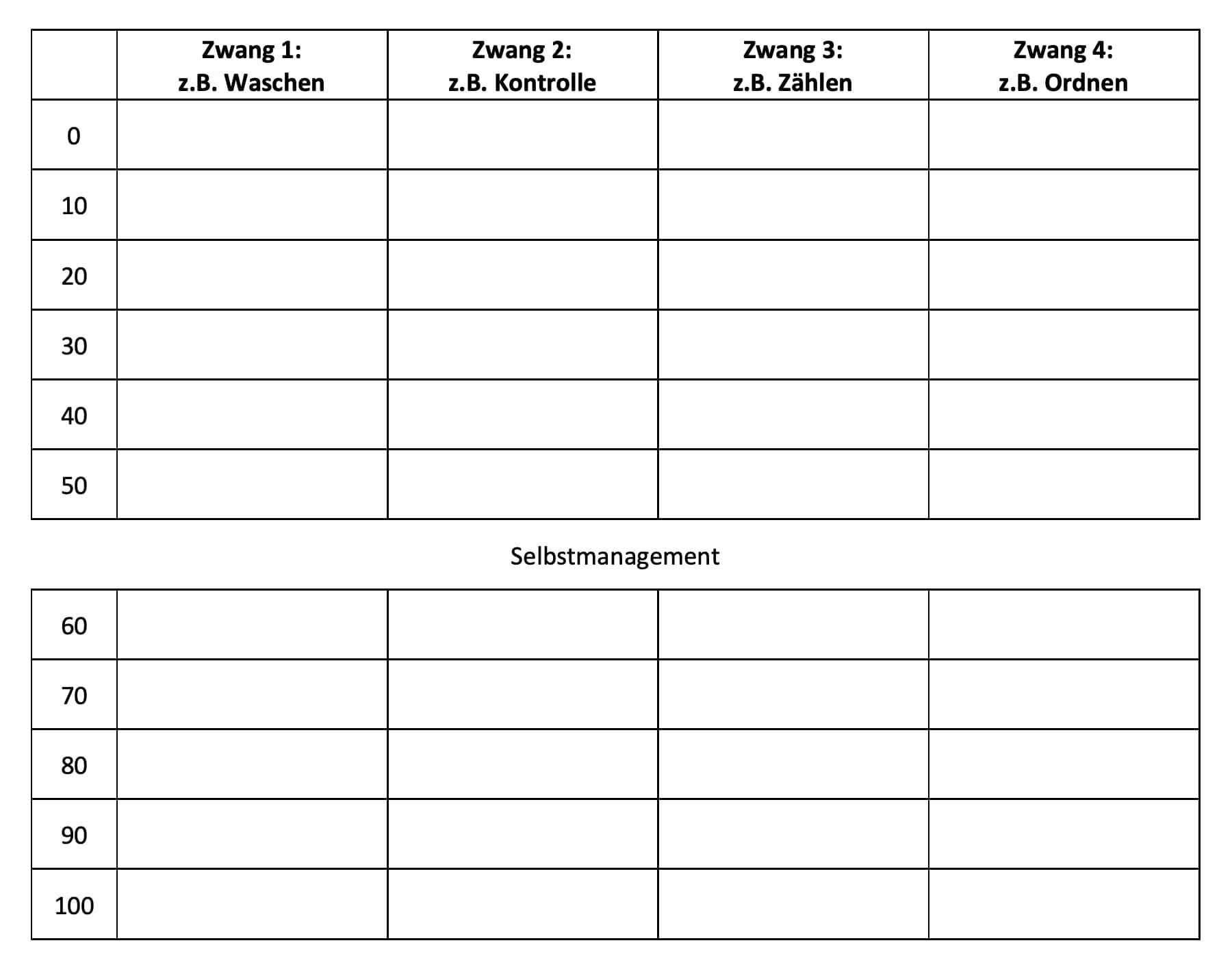 Das Aufschreiben allein fördert schon eine gewisse Distanz zu seinen Zwängen. Ein Zwang kommt selten allein, daher haben wir in den Spalten Zwang 1 - 4 die Möglichkeit, die Zwänge nach ihrem Thema zu unterscheiden. Die Aufteilung der Zeilen gibt den steigenden Schwierigkeitsgrad an: 0 entspricht dem entspannten Ruhezustand, 100 ist das Maximum, das sich viele von euch in diesem Moment noch gar nicht vorstellen können, jemals erreichen zu werden.