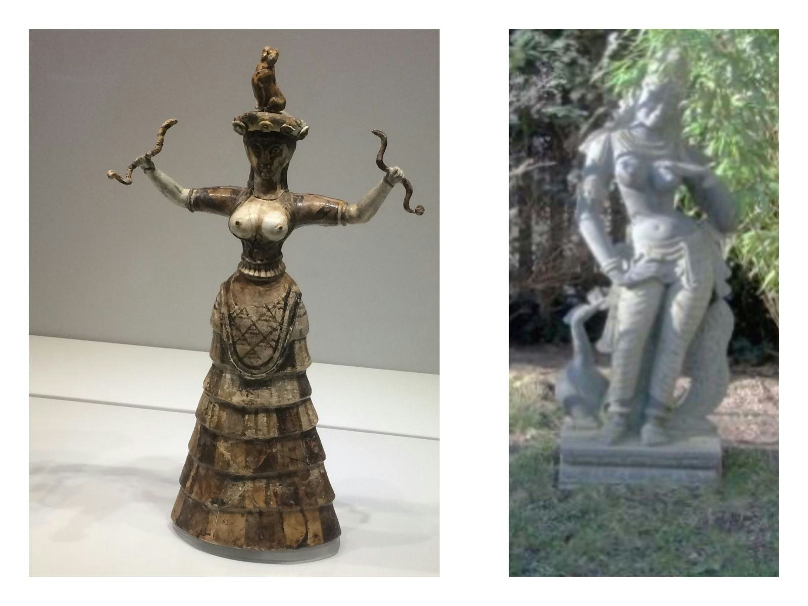 Minoische Schlangengöttin aus Kreta Knossos (links); Dancing Lady nach einer Vorlage aus dem Kamasutra Tempel Khajurho in Indien (rechts)